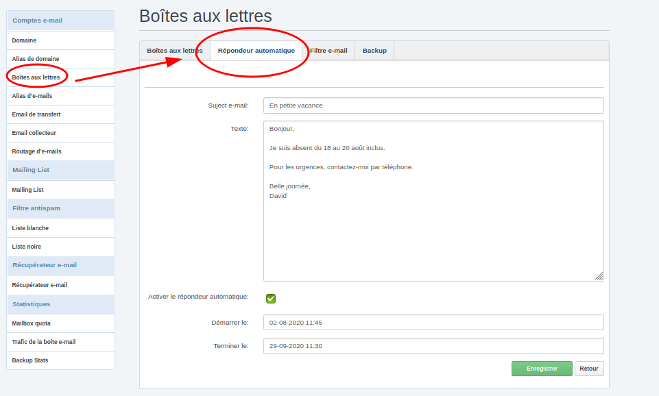 Si vous disposez des droits administrateurs : Connexion au panel d'administration puis dans le menu Email / Boîtes aux lettres / laboîte@emailquivousintéresse.com / Répondeur automatique