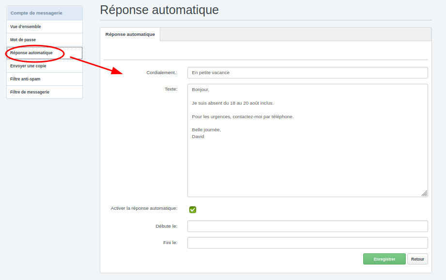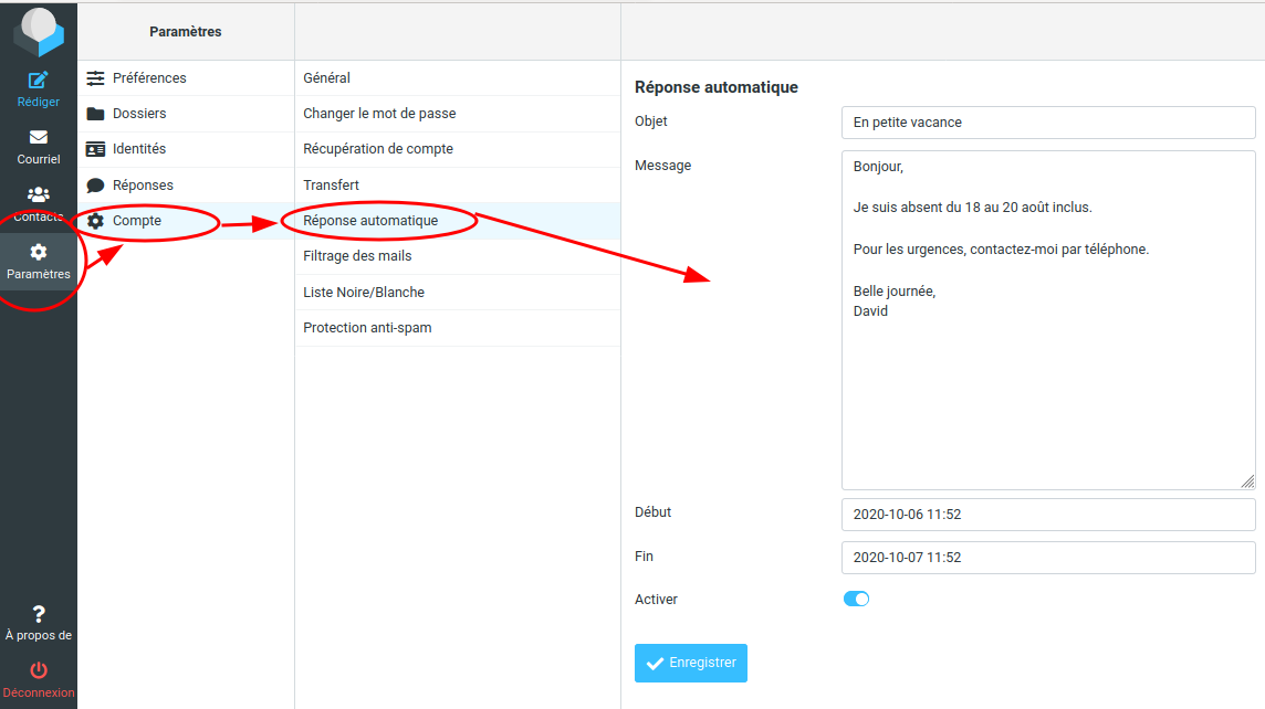 Connectez-vous au [webmail] avec votre email/mot de passe puis cliquer sur Paramètre / Compte / Répondeur automatique