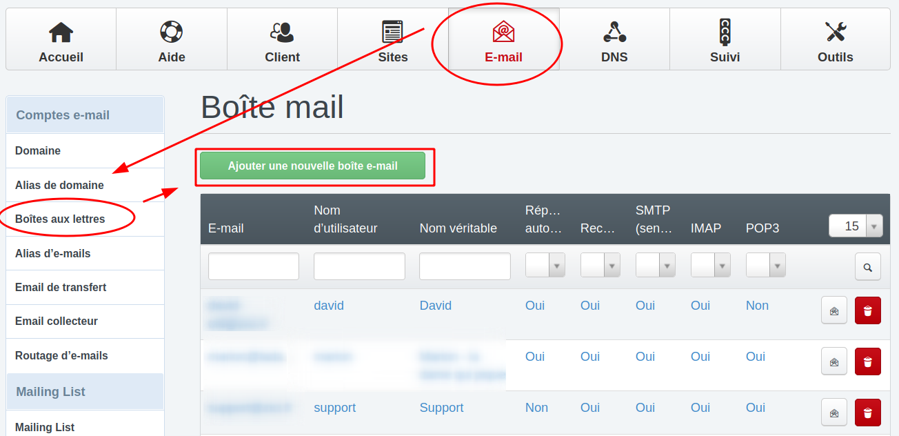 Connexion au panel d'administration puis dans le menu Email / Boîtes aux lettres / Ajout d'une nouvelle boîte e-mail