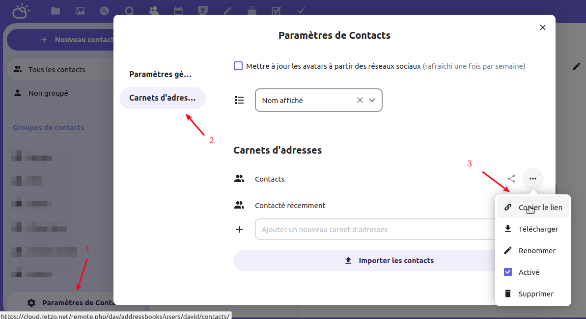 Rendez-vous à l'adresse de votre cloud (https://cloud.votredomaine.com) dans l'onglet "Contact". Ensuite :