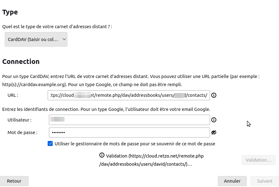 - URL : coller l'adresse (url) que vous avez préalablement récupérée type "https://cloud.votredomaine.com/remote.php/dav/addressbooks/users/votrecompte/contacts/"